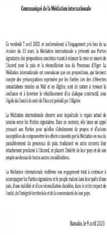 وزعمت الوساطة الدولية في بيان صحفي أنها قدمت للحكومة المالية والمتمردين السابقين " مقترحات ملموسة تهدف إلى إنقاذ وإحياء اتفاق السلام ". وفقًا للمعلومات ، تتضمنت الوثيقة " إجراءات ذات أولوية " يتم تنفيذها لاستئناف العملية. على سبيل المثال ، هناك تفعيل اللجنة المخصصة على التسلسل القيادي للقوات المسلحة المعاد تشكيلها. هذه واحدة من النقاط الحساسة.