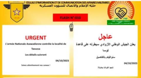 أعلن الجيش الأزوادي بسط سيطرته على قاعدة عسكرية لجيش المالي وفاغنر في منطقة توسا بدائرة بوريم ولاية غاو مساء اليوم الأربعاء 4 أكتوبر 2023 ؛ وكانت هذه خامس قاعدة عسكرية للجيش المالي وفاغنر يسيطر عليها الجيش الأزوادي في غضون شهر واحد منذ بداية العمليات العسكرية بين الطرفين.